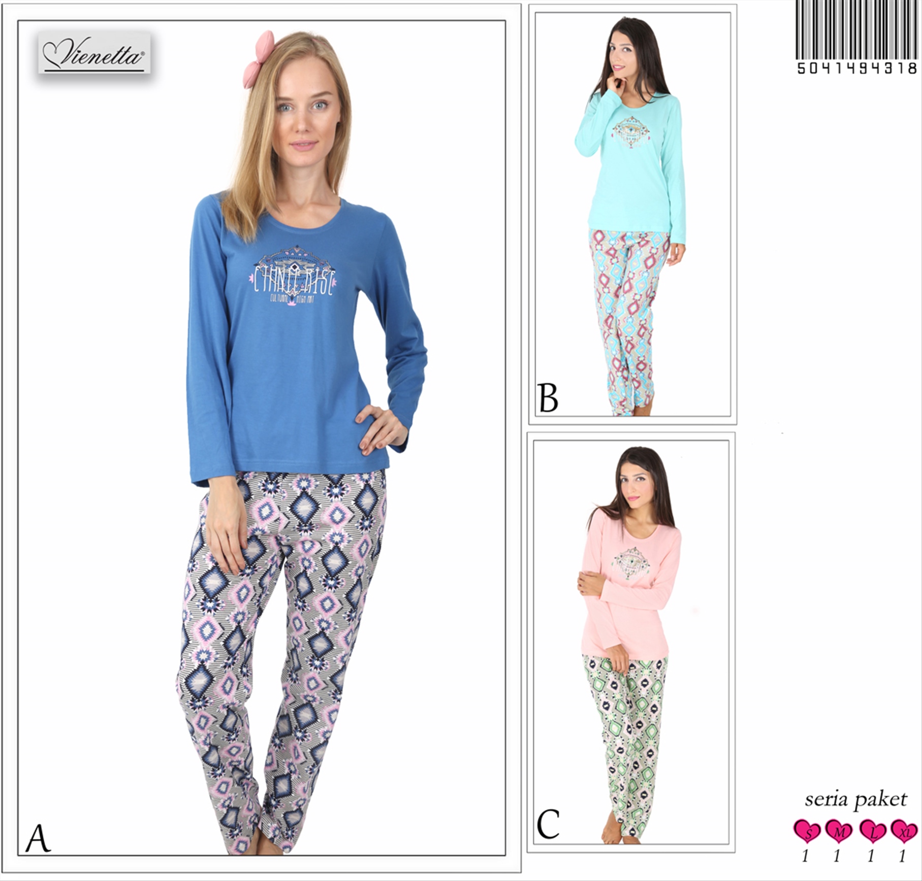 BAYAN PENYE SÜPREM O YAKA(YAKA DİBARİ) UZUN KOL PAÇA MANŞETLİ PİJAMA TAKIMI(TEK BASKILI) 5050404435 A B/ 1-1-1-1 6,20 $ 30,00 744,00 $