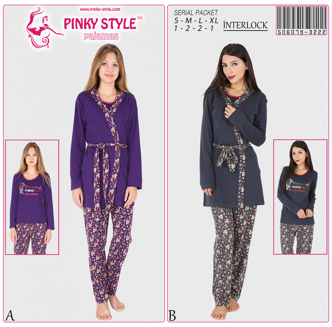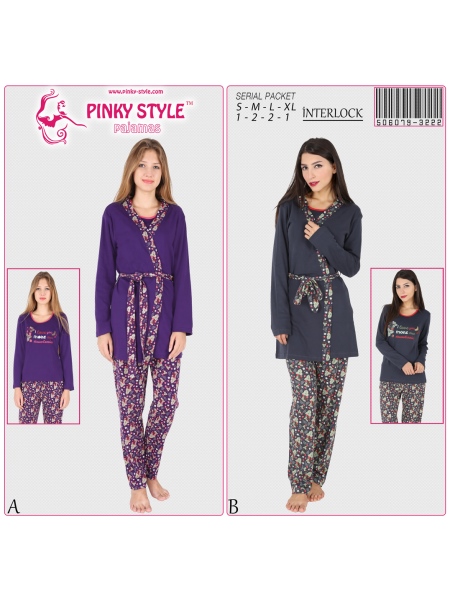PINKY - BAYAN INTERLOK BISIKLET YAKA UZUN KOL PIJAMA 3LU SABAHLIK TK. - 5060793222