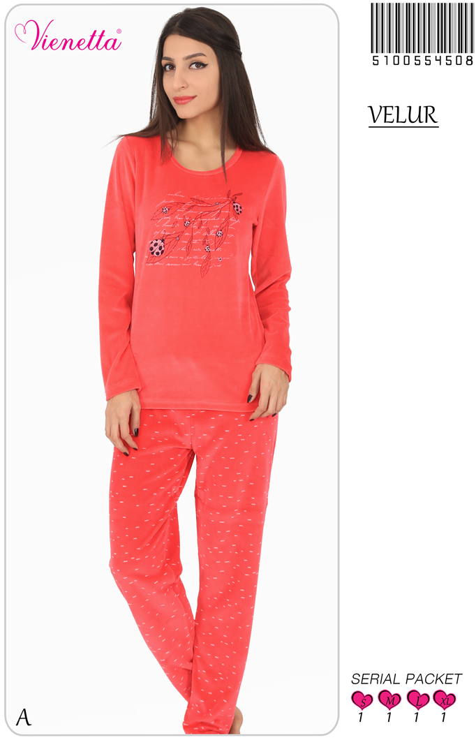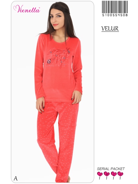 BAYAN KADİFE O YAKA(DAR REÇME BİYE) UZUN KOL PİJAMA TAKIMI ÇİFT BASKI KONTÜR BASK - 5100554508